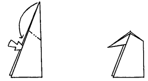 With the inside reverse fold you fold toward the open side so that the reverse folded section goes inside the two layers of paper. It is diagrammed using the mountain fold line, a thin arrow indicating the direction of the fold, and a fat arrow indicating that the section to be reverse folded will go between the two layers of paper.